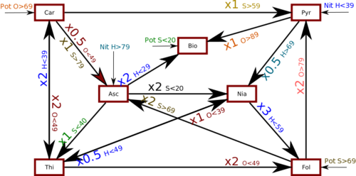 There are 3 conversions for producing each of the 7 vitamins; depending on levels of each of water, oxygen, or sunlight.